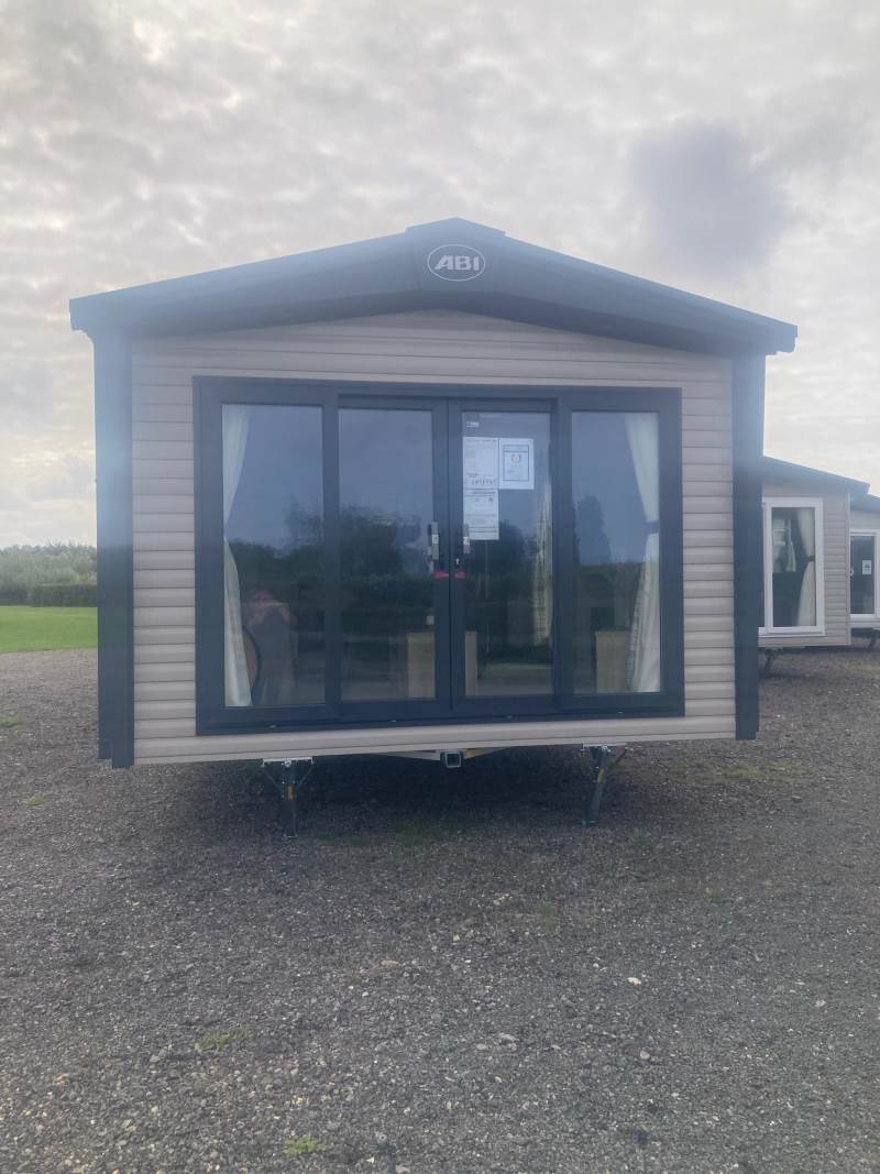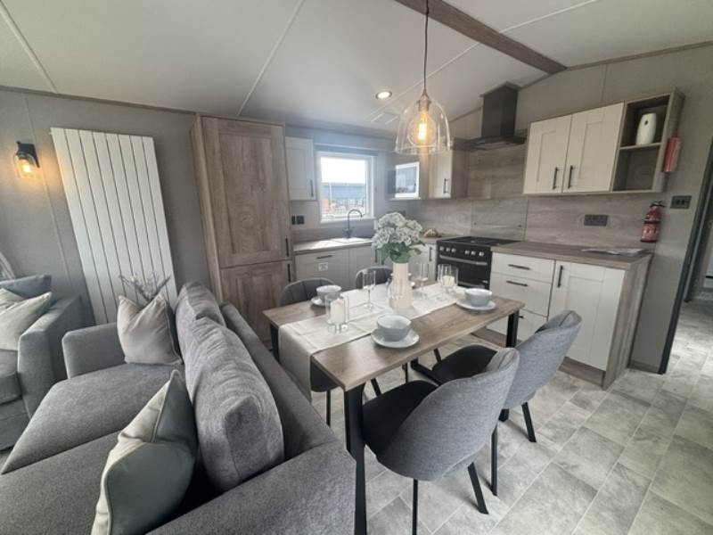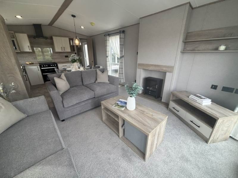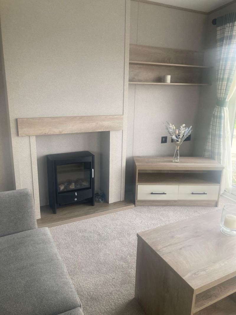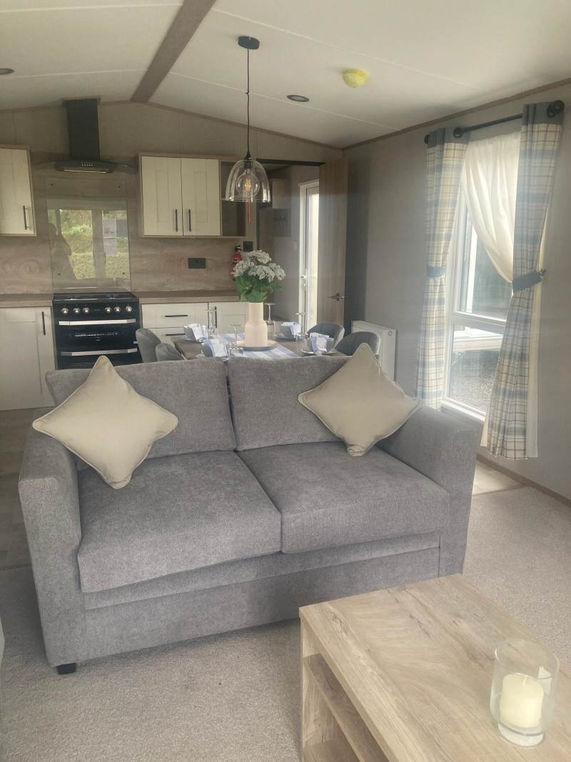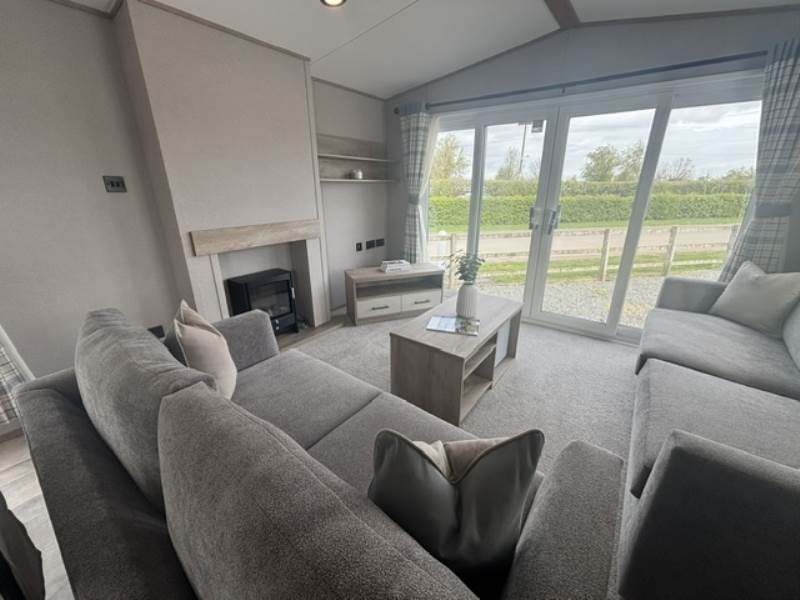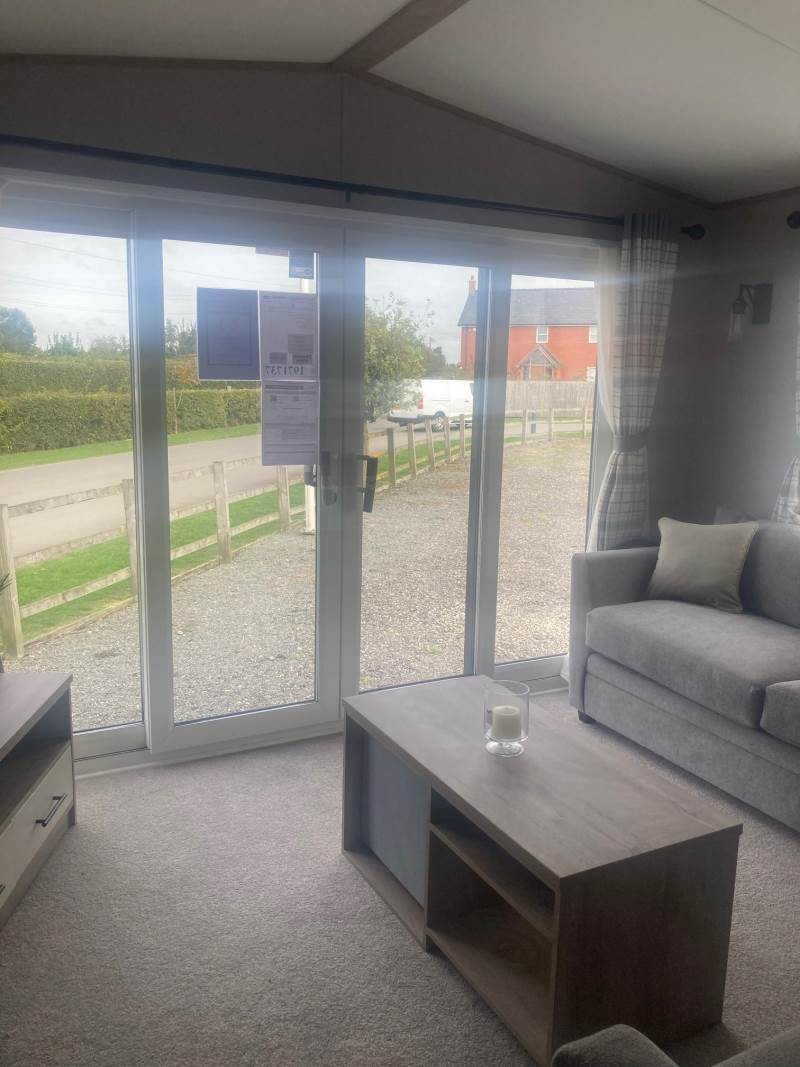 The lounge is light and airy with front patio doors, twin sofas, and feature radiator and a coffee table with cube stool.