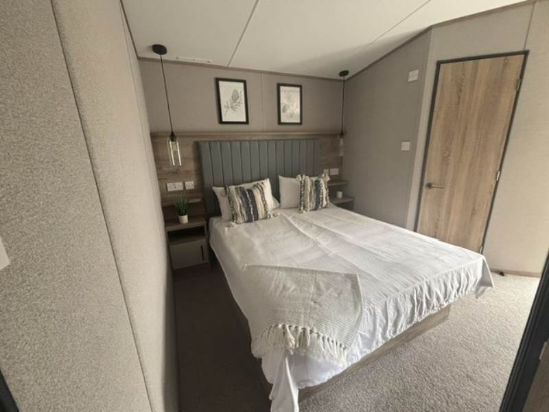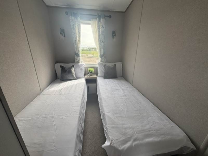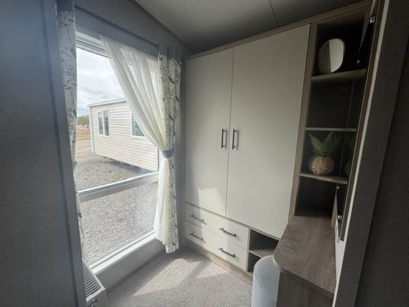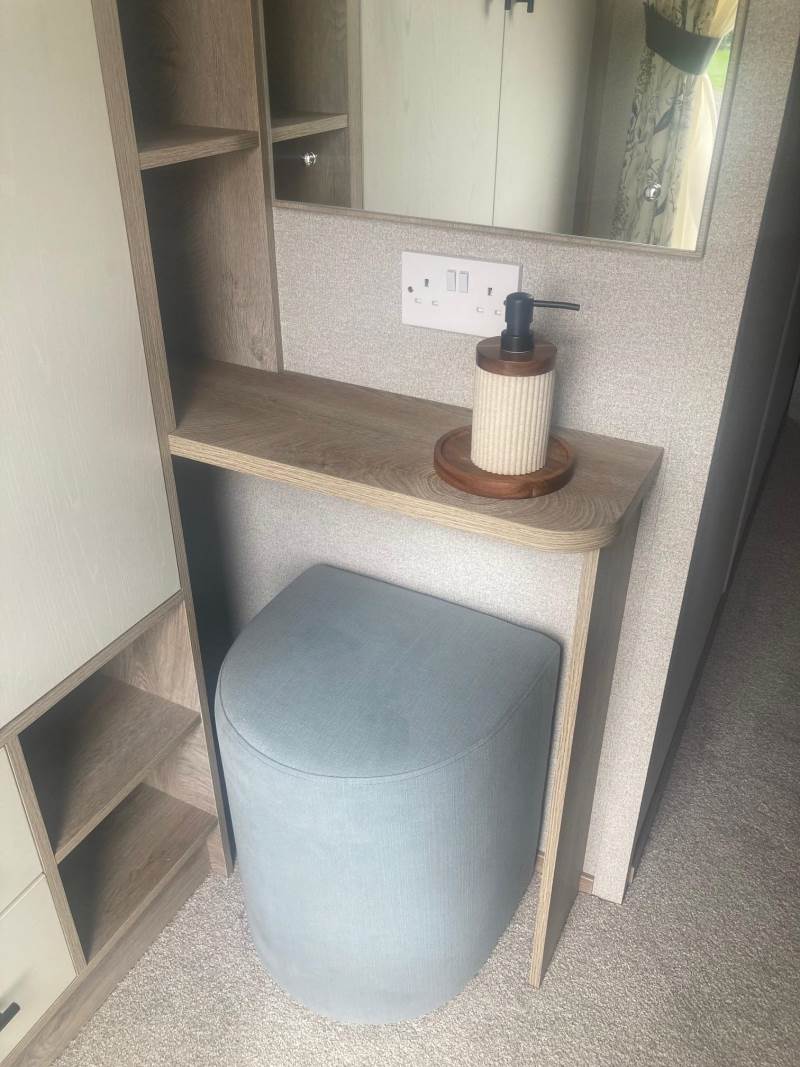 The twin room has a full height wardrobe and the master bedroom has lots of wardrobe space, a dressing table and upholstered stool and an en-suite bathroom.